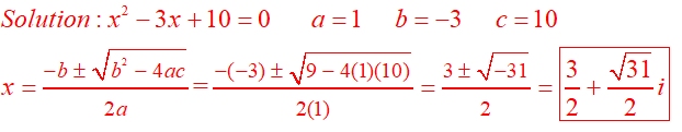Solve using the quadratic formula: x2 - 3x + 10 = 0