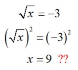 In the second graph, we see that graphing the squares of both sides, however, shows that the sides DO intersect, leading to a false conclusion that a real answer (x = 9) exists.