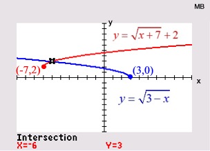 Graph each side of the equation and look for points of intersection. For example, with , the algebraic solution will show TWO possible answers. The calculator, however, will verify only ONE actual solution. The second algebraic solution is an extraneous root. |