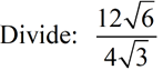To divide square roots, divide the values outside the radicals and divide the values inside the radicals. Simplify if needed.