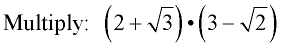 Multiply in the same manner as you would multiply two algebraic binomial terms. Distribute across the parentheses (FOIL).